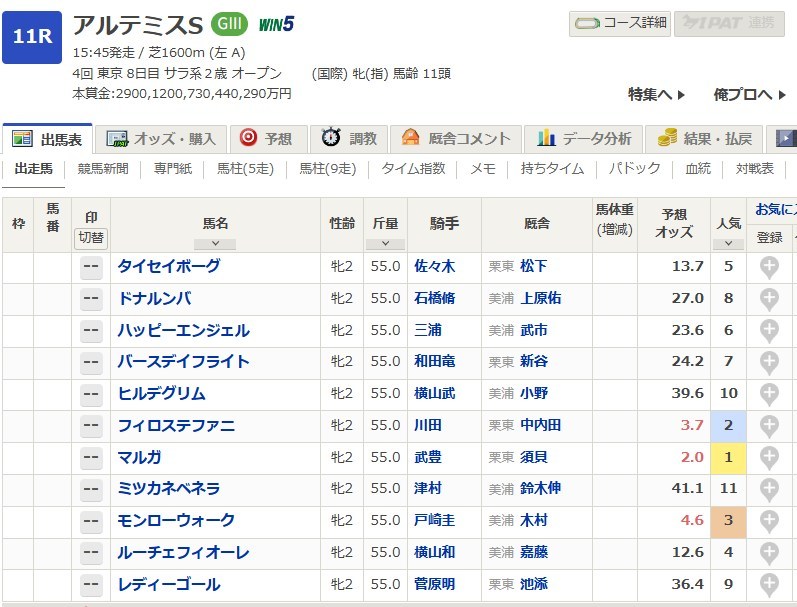 【アルテミスS2025データ分析】東京芝1600mで行われる2歳牝馬GⅢアルテミスステークス!今年はマルガ、フィロステファニが人気になりそうだが当然大穴狙いで逝く!データでは外枠有利!脚質は差し・追い込み!馬体重・騎手・血統・前走ローテ・上がり3F最速は?穴馬候補はタイセイボーグ、バースデイフライト、レディーゴール!