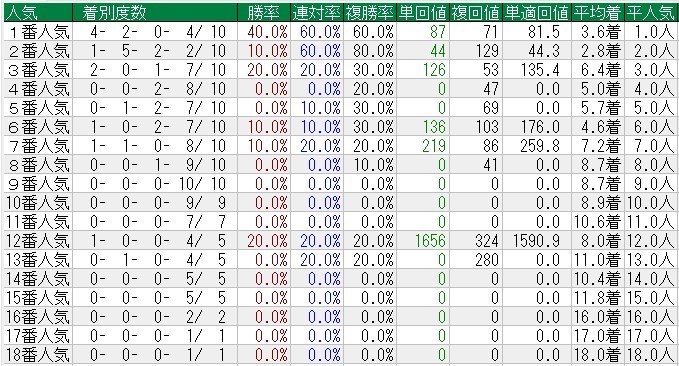 人気馬はまあまあ強い傾向。特に2番人気の馬券率半端なし。穴を狙うとしたら6~7番人気くらい。二桁人気の大穴は過去10年で2頭だけ。これだけ見るとあんまり荒れないんじゃね?と思ってしまうが、10頭前後で行われることも多いレース。そう考えると結構荒れてるよね。しかしなんで最近の2歳重賞は頭数が揃わんのだろうか?
