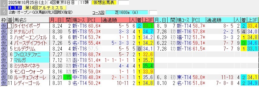 距離とか馬場とかペースにもよるので一概には言えんが・・・鬼脚持ちは前走で32秒台の脚を使ってるフィロステファニ。それからタイセイボーグ、モンローウォークもいい脚持ってそうだね。