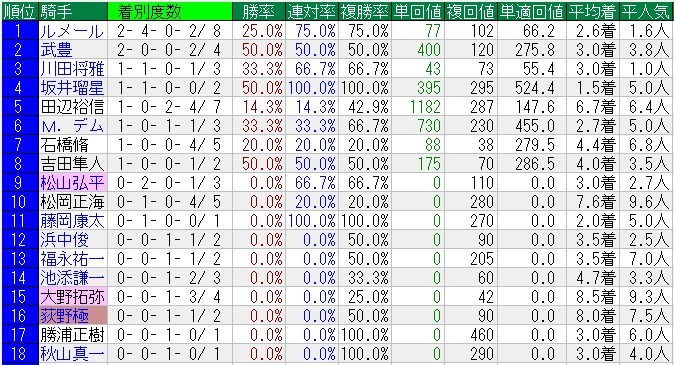 注目ローテは・・・新馬戦(10頭)、未勝利戦(12頭)、1勝クラス(5頭)。意外と多いのが新潟組で7頭、阪神組も7頭。それから中山組で6頭。札幌組が4頭。そして意外と少ないのが東京組。6月新馬組が出走して来そうなレースだが・・・実際にはあまり馬券に絡んでいない。前走着順は新馬未勝利は当然1着限定。1勝クラス以上は惜敗OK。これが一つの穴候補。この時期に負けると人気急落するので狙い目だ。