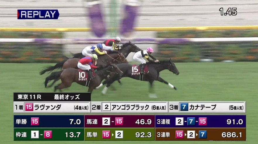 前にいるのがラヴァンダなわけだが・・・一瞬このラヴァンダの内に行こうとしちゃったんだよね。すぐ外に切り替えたわけだが、この時、手応えが良すぎてラヴァンダに乗りかかろうとしたため、僅かに手綱を引いてブレーキ踏んだのである。このせいで半馬身ほどロスったし、わずかに仕掛けも遅れたし、トップスピードに乗るのも遅れちゃったからねー。この一瞬の逡巡がなければもっともっと際どい勝負だったと思う。この後は当然エリザベス女王杯。今回負けたことによって当然激アツの一頭となるが。問題は今回のデキを維持出来るかどうかだねー。