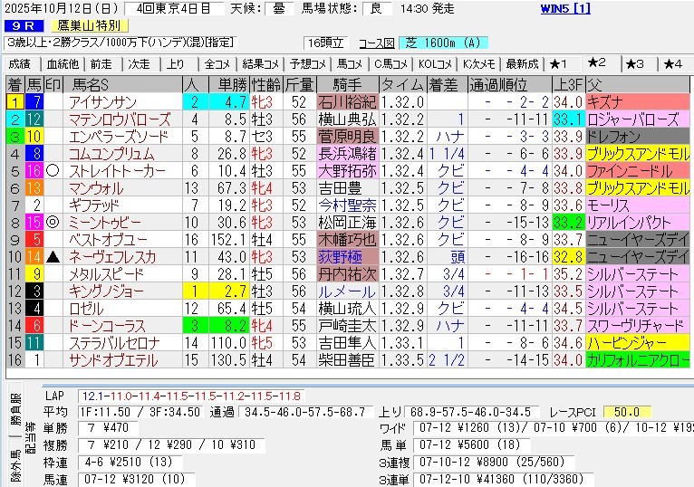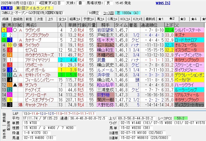 3着カナテープは悩んだ末に最後に切った馬。脚質的に東京が合うのは承知の助であったが、前走も前々走もハンデ軽かったからねー。人気馬の取捨でボンドガールやセキトバイーストを上に取ってしまったんだよね。しかし結果を見ると私が間違っていたようだ。充実一途。さすがにエリザベス女王杯は長いだろうから・・・次はマイルCSかな?