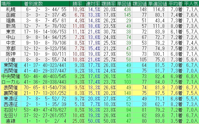 芝の競馬場別成績。最も良いのは東京!東京の芝に限ればA級種牡馬と言っていいだろう!他、阪神・小倉も得意。