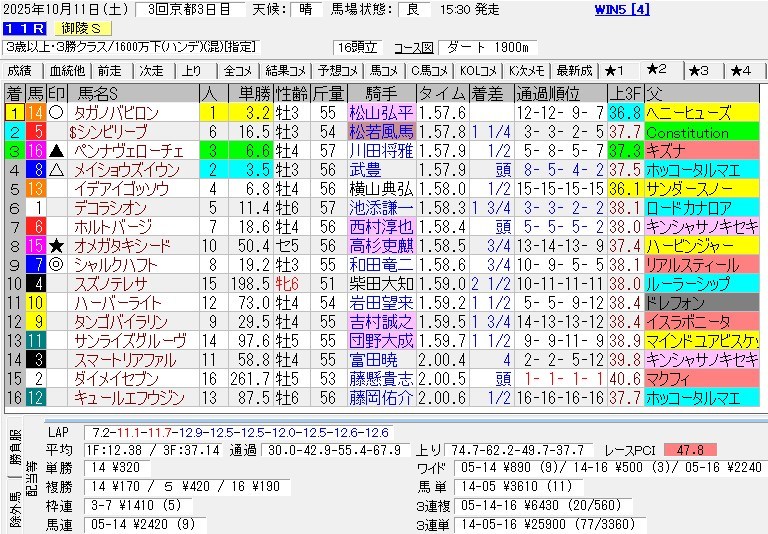 勝ったラヴァンダは大外枠だったんでね。中団の外で終始外々を回す競馬。直線も大外から豪快に脚を伸ばして見事に差し切った。馬場・展開・ポジションを考えると相当強い競馬をしたのは明白でね。賞金的にもここを勝てたのはデカい。もちろん次はGⅠエリザベス女王杯。距離は伸びても全く問題ないと思うし、京都の外回りも合うと思う。気になるのは仕上がり面。もともと叩き良化タイプではあるが、今回絶好の仕上がりだったんでね。さらなる上積みがあるのかどうか?調教要チェックですな。