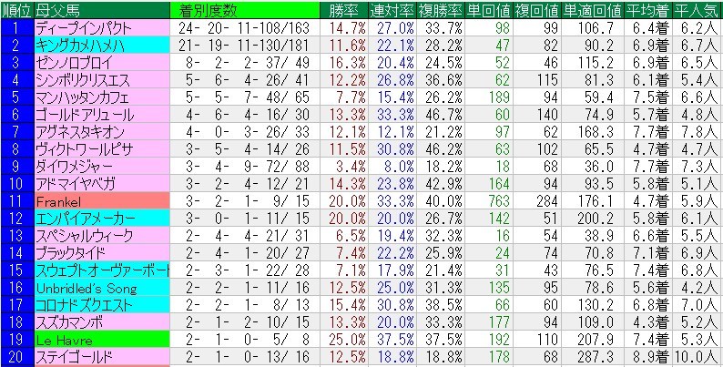 母父別の成績。サンデーサイレンスもミスタープロスペクターも持たない種牡馬なのでね。もう日本の牝馬には付け放題。社台SSでの繋養なので当然のようにサンデー系との配合が多いわけだが、圧倒的に相性良さそうなのはディープインパクト!全てが半端ない数字となっており、これはもうニックスと言っていいだろう。イメージ的にも「瞬発力タイプ×瞬発力タイプ」という感じで相性良さそう。ディープインパクトほどではないがキングカメハメハも相性良いね。