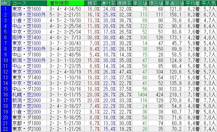 得意なコースは・・・「東京芝1600m」「阪神芝1600m」「小倉芝1800」。なるほどつまり・・・瞬発力コースが得意というわけ。特に東京マイルは絶好の狙い目だ!ちなみに、今週穴を開けたのは京都芝2400mだった。