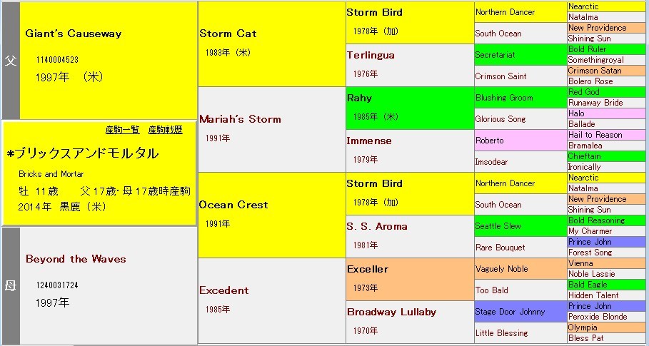 現在の2歳が3世代目。繋養先は社台SS。アメリカ産ストームキャット系。母父もストームキャット系という日本では考えられないようなクロス持ち。牝系もかなりマニアック。現役時代はアメリカの1800~2400の芝GⅠを5勝した名馬。初年度から600万円という高い種付け料となったが、それでも大人気で2年連続180頭前後に種付け。初年度産駒からいきなりコンバデカーブースがサウジアラビアRCを勝ったが・・・その後はまだ大物は出現しておらず。一見ダート短距離っぽい血統だがさて産駒の傾向はどうなのか?まだ3世代しかいないのでね。怪しいところはあるが簡単に見てみよう。