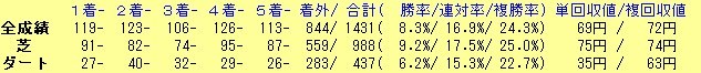 2場開催だが、減量騎手以外はだいたいいつものメンバー。ただ、来週から新潟開催が始めるのでまた多少傾向が変わるかもしれない。丹内はデータ的に東京はかなり苦手なんだが、今週は3勝を挙げた上に結構穴も開けてたからね。今はあまり苦手意識はないのかもしれん。京都で大暴れだったのが高杉。先日100勝をクリアして減量が取れたわけだが、全く関係ないと言わんばかりに馬券に絡んでるからね。来週以降も用意注意。松若と貫太にも引き続き注意!