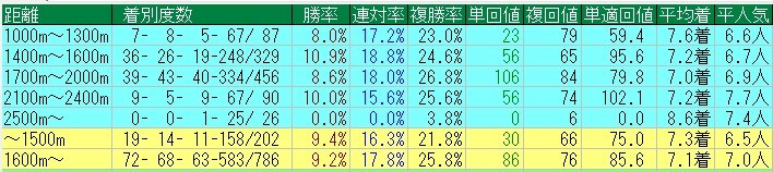 芝の距離別成績。どの距離でも満遍なく走るが、どちらかと言えばマイル以上の方が良さそう。