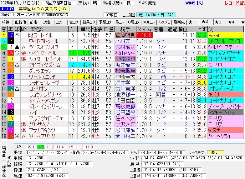 勝ったのはオフトレイル。スタートで出遅れちゃったんだけどね。行きっぷり良く中団後方に付け、馬群の中で脚を溜め、直線は馬場の真ん中から堂々抜け出して快勝。レコードそのものは馬場の影響が強いからそこまで重要視する必要はないが・・・前半出遅れを挽回するのに脚使ってるからね。相当強い内容だったと思う。これで1400m戦は【1.1.1.0】。これはもう間違いなく1400のスペシャリスト。特に京都はピッタリなんだろうね。この後はおそらくマイルCSになるかと思うが・・・穴党的出し入れ論で言えば、暮れの阪神Cで狙いたい。