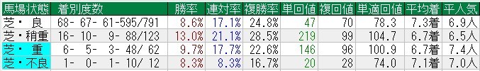 芝の馬場別成績。分母が少なく微妙だが、最も成績が良いのは稍重。やや渋った馬場が得意。重馬場も苦にしないが不良は苦手。