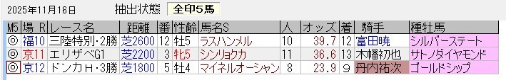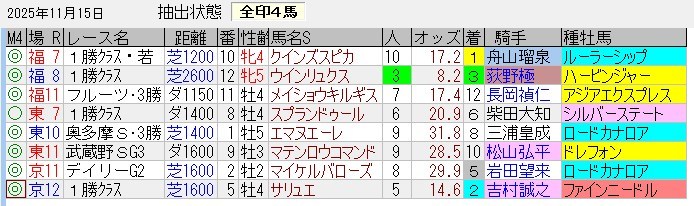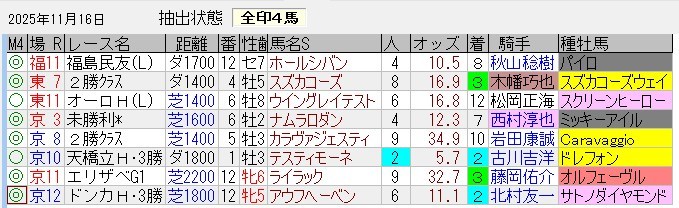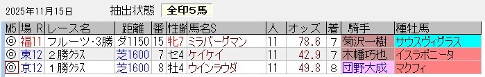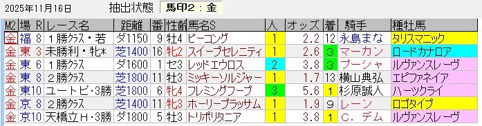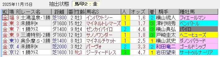 馬券内パーフェクトの好成績。ちなみに、キンタ馬は「3着以内に来る馬(馬券の役に立つ馬)」「過剰人気になっていない馬」というコンセプトで抽出している。単勝1倍台の馬やルメール・川田騎乗の馬は抽出しないようにしているが(川田はたまにある)、抽出した後に人気になってしまうケースもあるのでその点はご容赦を。