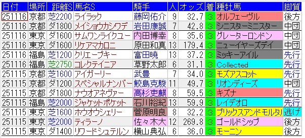 惜しかったのがラケマーダ。この馬も中団後方に居たのだが、直線ゴチャついて挟まれたり蓋されたり前が詰まったりで全くスムーズじゃなかったんだよね。それでもラスト200mはレッドモンレーヴに匹敵するような脚を見せて3着。この馬の過去の成績を見てみると・・・この馬、好走しても好走しても全く人気にならない謎馬。そして好走と惨敗を繰り返す馬なので狙い続ける価値がありそうだね。