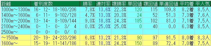 当然短距離系かと思いきや・・・最も成績がいいのは1700~2000mの中距離!まあ短距離も悪くはないんだが、狙うなら断然中距離だ!その回収率は185%。平均人気7.5に対し、平均着順は7.1!やはり多くのファンが「レッドファルクス=短距離」というイメージを持ってるわけだ。これは非常に面白いねー。