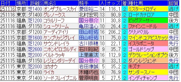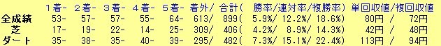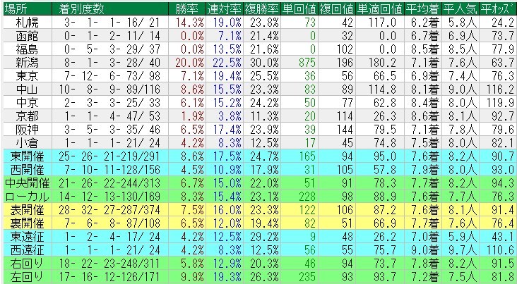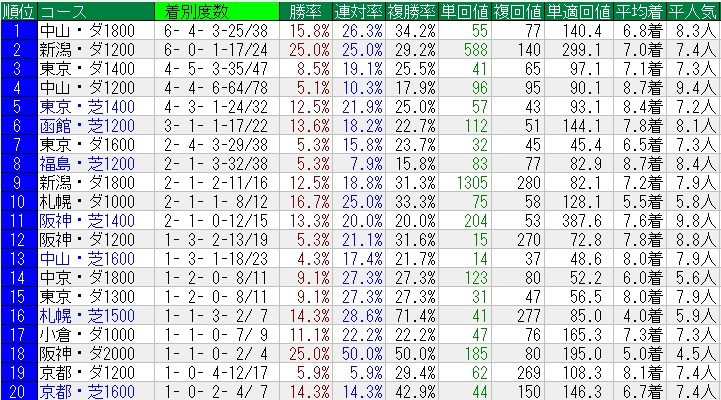 得意コースは・・・「中山ダート1800」「新潟ダート1200」「東京芝1400」「函館芝1200」「新潟ダート1800」など。分母が少ないのであれだが、ダートの中距離はやはり狙い目ですな。