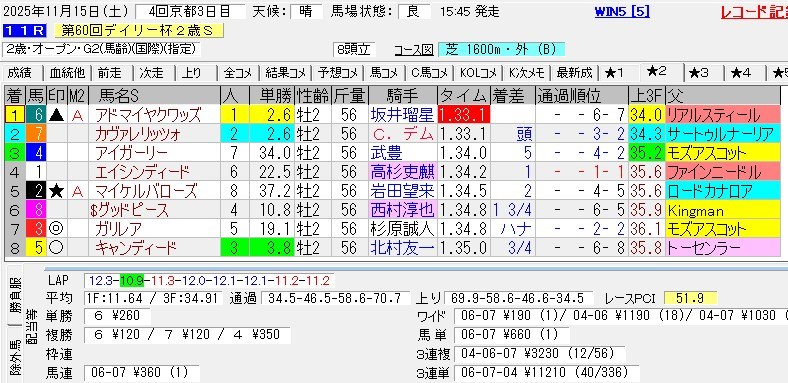 8頭立てとなった2歳重賞のデイリー杯2歳S。逃げたのはエイシンディードで600m通過は34.5、1000m通過は58.6という速いペース。それでいてラストは34.5(12.1-11.1-11.1)という超ハイレベルなレースでね。時計は1:33.1の2歳レコードだった。