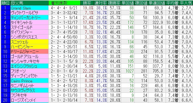 これも分母が少ないのでハッキリしたことは言えないが、サンデーサイレンス系が多いね。全体的にパワー寄りなイメージ。