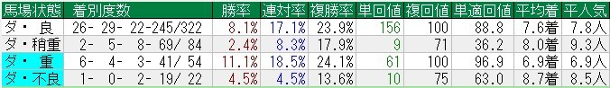 ダートの馬場別成績。これも分母が少ないので再現性は怪しいが、重の成績が良く、不良だとイマイチ。ハッキリしたことは言えない。