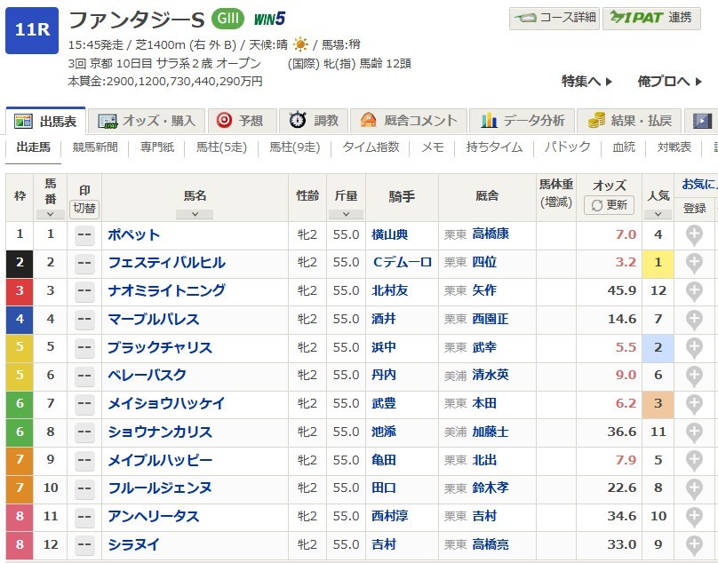 【ファンタジーS2025予想】京都芝1400mで行われる2歳牝馬GⅢファンタジーステークス!人気はフェスティバルヒル、ブラックチャリス、メイショウハッケイだが当然大穴狙いで逝く!展開・隊列・ペースはどうなる?逃げるのはメイプルハッピー?ブラックチャリス?ペースはスロー?浅次郎の狙いはこの馬だ!