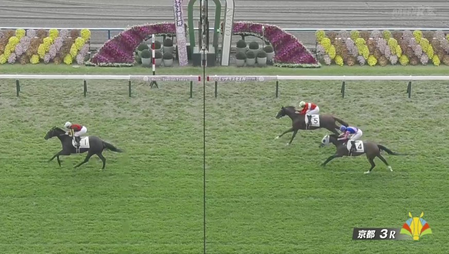 今日の3Rは芝1800外回りの2歳未勝利戦。3Fは36.4、1000mは62.6のスロー。ラスト3Fのヨーイドンの競馬になったのだが、勝ったのは好位追走から外に出してアッサリ抜け出したフォルナックス。この馬の上がりは33.9。2着は2番手から粘り込んだパウワウビート。3着は外から差したメイショウヒタカミ。時計は1:49.4。やや時計かかってる感じか。直線は皆、内を避けてた感じ。