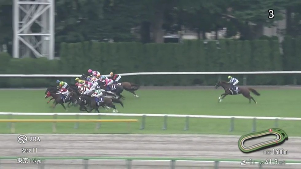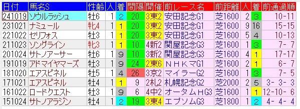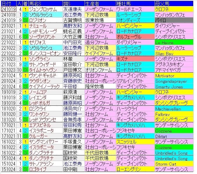 それから、大穴になりそうなシャンパンカラー!社台F生産のドゥラメンテ産駒(キングカメハメハ系)。美浦・田中剛厩舎。鞍上は戸崎。戸崎かあ。内田のままでいいのになあ。いや、戸崎だと無駄に人気になっちゃうじゃんね。2023年のNHKマイルC勝ち馬であるが・・・その後は惨敗続きでね。前走の安田記念でも14番人気ともうGⅠ馬の面影もなく全く人気なかったのである。だけんどもしかし!このレースはもうスタートでとんでもなく出遅れてしまったのである。
