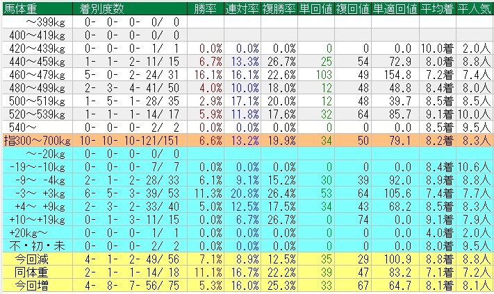馬体重の最低ラインは440kg。馬体の増減は少ない方がいいが。どちらかと言えば、馬体増の方がいい。