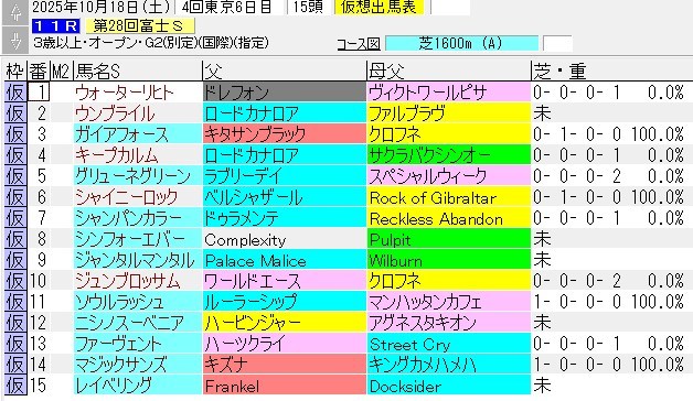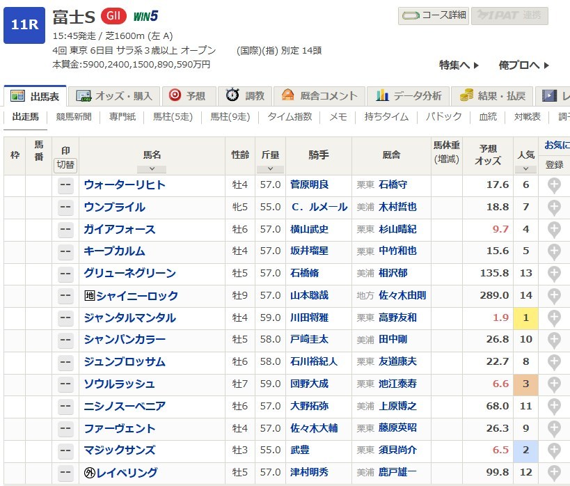 【富士S2025データ分析】東京芝1600mで行われる別定GⅡ富士ステークス!今年はジャンタルマンタル、マジックサンズ、ソウルラッシュが人気だが当然大穴狙いで逝く!データでは外枠有利?脚質は差し?人気・馬体重・騎手・血統・前走ローテ・上がり3F最速は?穴馬候補はガイアフォース!ウォーターリヒト!シャンパンカラー!
