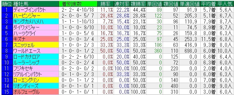 ディープインパクト、ハービンジャー、キングカメハメハ、ロードカナロアあたりが狙い目か。