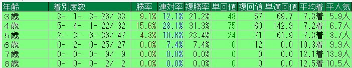 4歳が強い。次いで3歳。それから5歳。6歳以上は割引きのデータだが・・・ソウルラッシュは7歳、ガイアフォースは6歳だねえ。