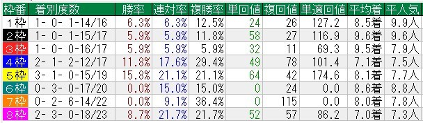 ワンターンの東京マイル戦。あまり枠順の有利不利は無いコースであるが、ご覧のように内枠よりむしろ外枠の方が良い。