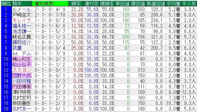 ルメール(ウンブライル)、戸崎(シャンパンカラー)注意。