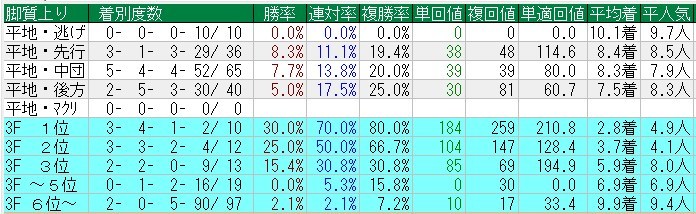 脚質パターンは・・・「差し→差し(追い込み)」ほとんどがこの差し決着!まれに「先行→差し」という決着もある。速い上がりは必須。良馬場スローなら上がりは33秒チョイ。