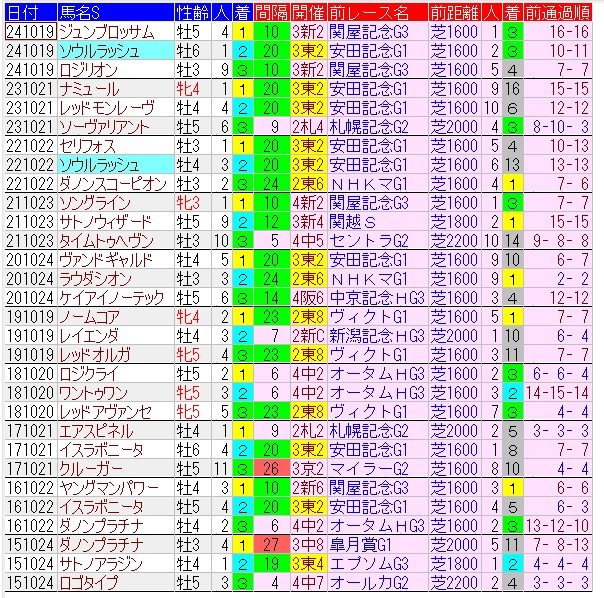 注目ローテは・・・安田記念(8頭)、関屋記念(4頭)、京成杯AH(3頭)、ヴィクトリマイル(3頭)。構図としては春のGⅠ組vs夏~秋のGⅡ~GⅢといった感じ。重賞以外からのローテではかなり厳しい。前走距離はほとんどが1600m。1400m以下はゼロ。2000m以上はGⅠ~GⅡなら問題なし。春のGⅠ組は着順不問。GⅡ~GⅢ組は好走条件とする。