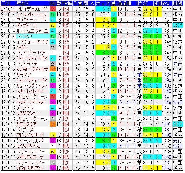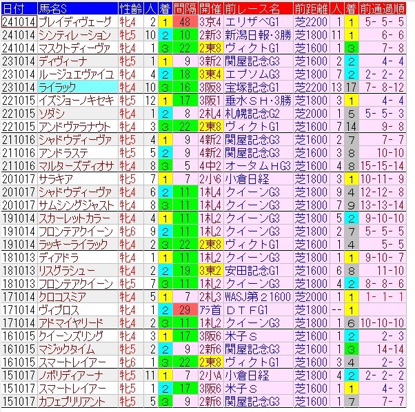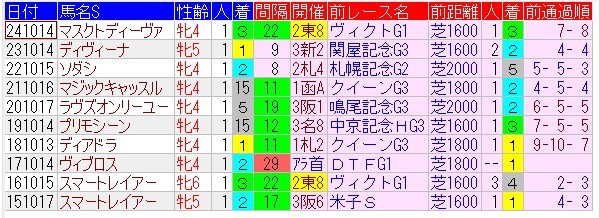 注目ローテは・・・クイーンS(7頭)、関屋記念(5頭)、ヴィクトリアマイル(4頭)。その他のGⅠが4頭。オープン特別4頭。準オープン3頭。構図としては春のGⅠ組vs夏の上がり馬といった感じ。前走距離はほとんどが1600~1800m。例外はGⅠ。しかし今年は・・・去年のブレイディヴェーグやマスクトディーヴァといったGⅠクラスの馬がおらず・・・混戦模様と見て良さそうだね。クイーンS組は9着以内くらいに走ってればOK。関屋記念も着順はあまり気にしなくていい。ヴィクトリアマイル組の方がむしろ好走条件と言える。