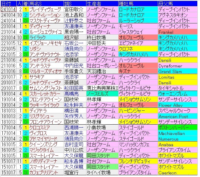 それから、大穴扱いになりそうなライラック。浦河・杵臼牧場生産のオルフェーヴル産駒。美浦・相沢厩舎。鞍上は石川。これまたいつも見てくれる毒者は知っていると思うが・・・これまで度々◎を打ってきた馬である。もう昔のことは割愛するが、前走のクイーンSでも◎を打ってたんだよね。しかし結果はゴール前猛然と外から強襲するも4着・・・という結果(10番人気)。もう丸2年ほど馬券に絡んでいないが、GⅠエリザベス女王杯でも僅差の競馬をしているようにGⅠでも勝負になる馬なのである。密かに2023年の当レース3着馬でもあり、乗り方やポジション次第で一発あると思う。この馬の問題も仕上がり。目標は次のエリザベス女王杯だろうからね。ここは叩きの可能性アリ。