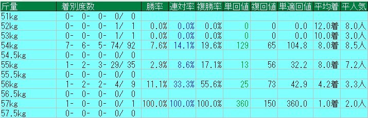 格別定。GⅠ勝ちがあれば2kg増、GⅡ勝ちがあれば1kg増のやつね。以前は基本54kgだったが、一昨年から55kgに改定。57kgで走ったのは去年のブレイディヴェーグ。56kgのほとんどがGⅠ馬。その成績は【1.2.2.4】。馬券には絡むが勝ち切れていない。斤量は結構効くと見ていい。・・・って今年はサフィラを除いてみんな55kgやん。例年よりレベルが低い感じあるね。