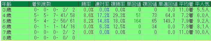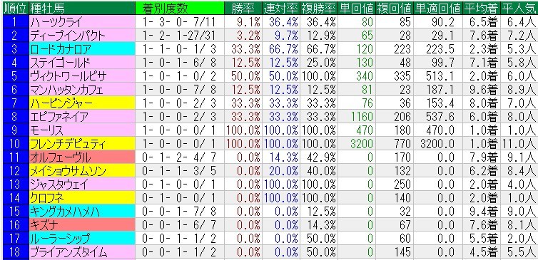 結構バラバラだねー。条件的に合いそうなディープインパクトはイマイチな成績。普通にサンデー系中距離タイプが優勢。あとは一見合わなそうなノーザンダンサー系のパワータイプも面白い。