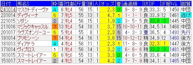 脚質パターンは・・・「差し(追い込み)→差し」「逃げ→差し」「追い込み→先行」。馬場が良ければ上がりは33秒台。32秒台になるケースもアリ。東京向きの瞬発力タイプを狙いたい。しかしこうやって見ると結構荒れてんなあ。