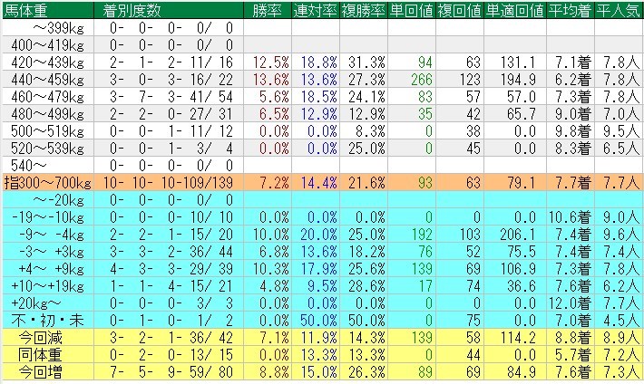 馬体重の最低ラインは420kg。馬格がなくても気にする必要なし。むしろ小さい方が好成績だし、500kgオーバーの大型馬の成績は悪し。馬体の増減は馬体増が優勢。
