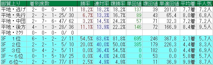 やはり、差し・追い込み優勢。上がり1位は猛烈に強く・・・特に追い込み馬注意。上がり2位も強く・・・もう瞬発力必須だね。矛盾するようだが逃げ馬にも注意が必要。