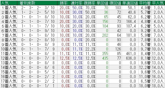 1番人気はそこそこ強く、2番人気もまあまあだが、3番人気が弱く、全体的には平均的。過去10年で7番人気、11番人気、12番人気の馬が勝っており、大穴狙いもOK。