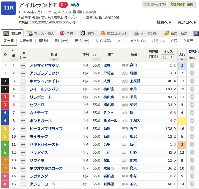 仮に逃げるのが最内枠のアドマイヤマツリ武豊なら、豊マジック発動でスローになりそう。武豊が控え、外からセキトバイースト、サフィラあたりが競り合って行くようならペース速くなるか。もちろん、競り合うことなくすんなり隊列が決まって平均的に流れるケースもあるだろう。