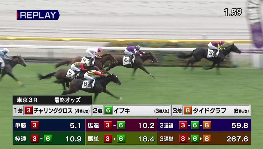 今日の3Rは芝2000の2歳未勝利戦。1000m通過は60.8。上がりは34.9。勝ったのは中団イン待機から直線内を突いて差したチャリングクロス。ちなみにこの馬はクロワデュノールの全弟だ。新馬戦からは一変の内容だったねー。2着は後方インのいたイブキ。チャリングクロスの後をそのままトレースする感じで内から伸びてきた。3着は外から差してきたタイドグラフ。差し決着となったわけだが、内を突いた馬がワンツー。