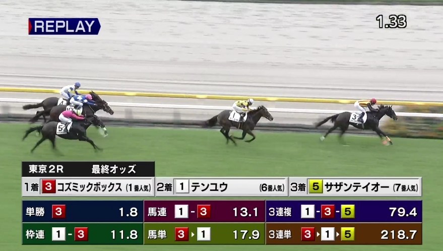 今日の2Rは芝1600mの2歳未勝利戦。1000mは59.8と2歳未勝利戦にしてはそこそこ流れた感じか。上がりは34.2。勝ったのはルメール騎乗のコズミックボックス。好スタートから淡々と逃げ、直線半ばでテンユウが外から追い込んできたが・・・もう一度脚を伸ばし、突き放して完勝。3着は好位から脚を伸ばしたサザンテイオー。