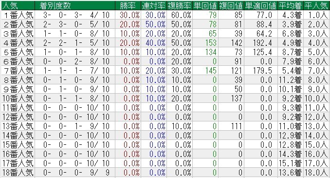 人気馬の成績はまあ平均的。1着はやや堅い傾向だが、2~3着のヒモ荒れは普通に狙える感じ。ただし、二桁人気の大穴は分が悪く、過去10年で3頭のみ。穴を狙うにしても6~10番人気くらいの中穴が吉。