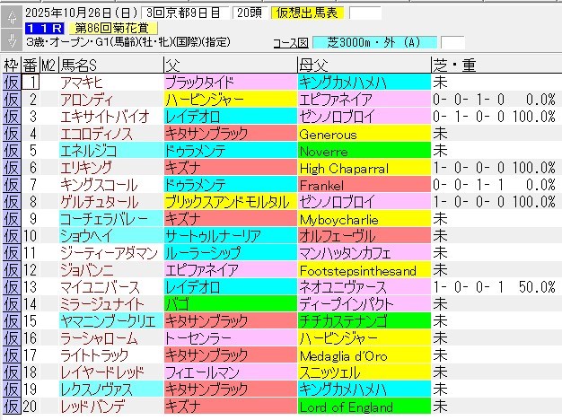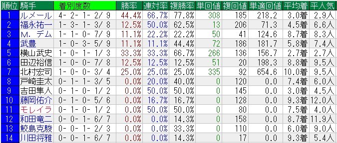 る、る、ルメール無双(エネルジコ)。長距離は騎手って言うけどあからさまだねえ。武豊(マイユニバース)にも注意。そして、川田(エリキング)の成績はイマイチ。長距離の川田は色々と言われてるわけだが今回はどうだろうね。