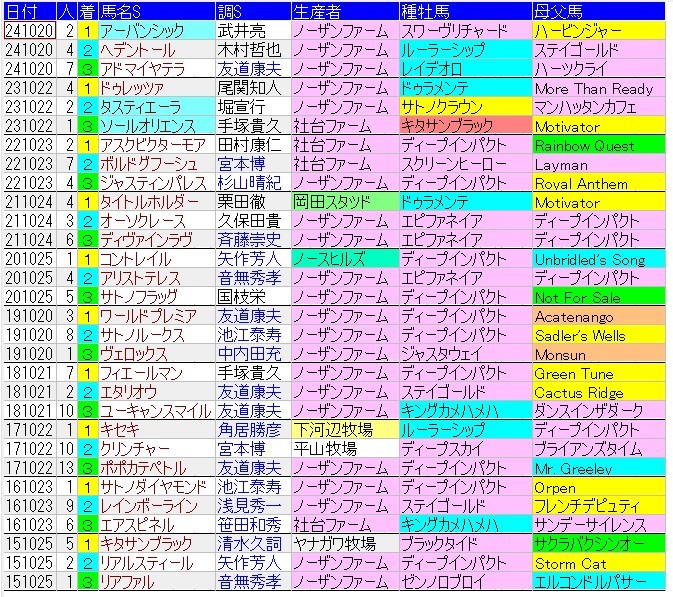 関西馬優勢・・・以前は関西馬が猛烈に強かったのだが、最近は関東馬が巻き返しており、ここ4年は関東馬が勝利。東西互角の意識でいいだろう。そして・・・社台系、特にノーザンFが猛烈に強い。なんと過去10年で21頭が馬券に絡んでいる。血統的にはディープインパクト無双だが、その直系(キズナなど)が活躍しているわけではないのは注意点。母系はノーザンダンサー系が多いね。全体的な印象としては長距離というより中距離。