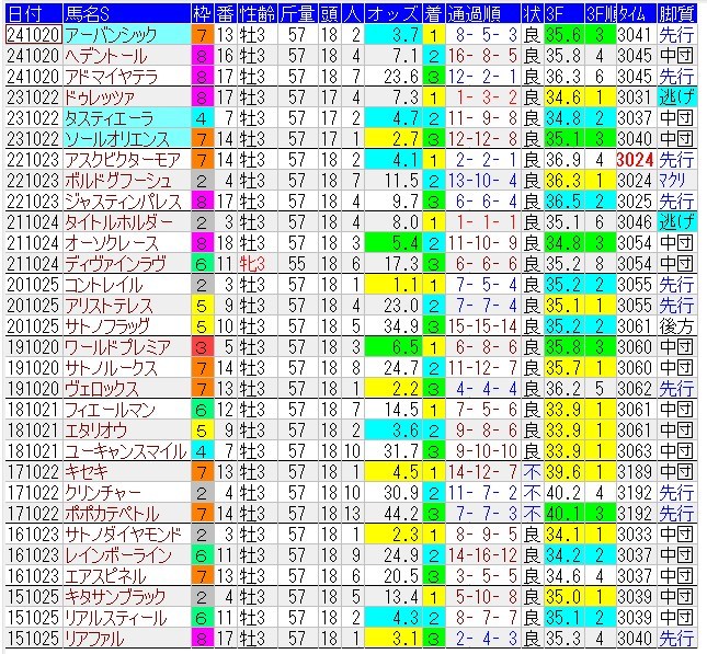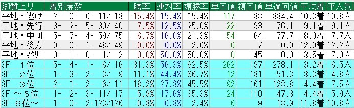 脚質パターンは・・・「差し→差し(追い込み)」「逃げ→差し」。ご覧のように圧倒的に差し優勢。ただし、強い逃げ馬がいれば要注意。番手好位タイプの先行馬は厳しい。