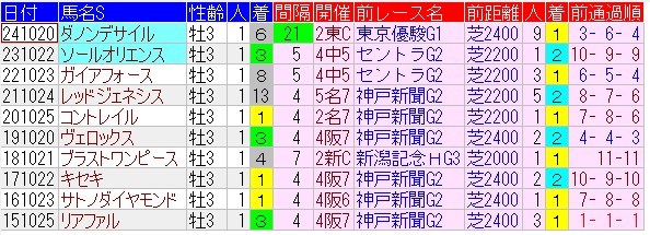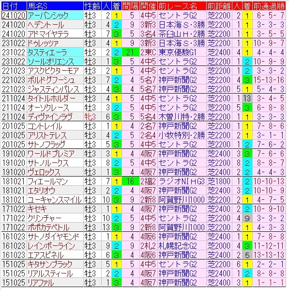 注目ローテは・・・神戸新聞杯(11頭)、セントライト記念(9頭)、2勝クラス(5頭)。この3つで8割以上を占める。あと数は少ないが3勝クラスからのローテも有力。前走距離は2200~2400m。例外は2頭だけ。神戸新聞杯組は3着以内条件、セントライト記念は2着以内条件だが、マレに惨敗組が穴を開ける。2勝クラス・3勝クラス組は1着限定。