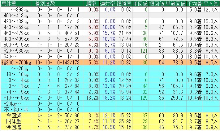 馬体重の最低ライン440kg。乙牌と一緒でデカければいいというわけではなく、460~499kgくらいが理想。馬体の増減は馬体増の方が優勢。